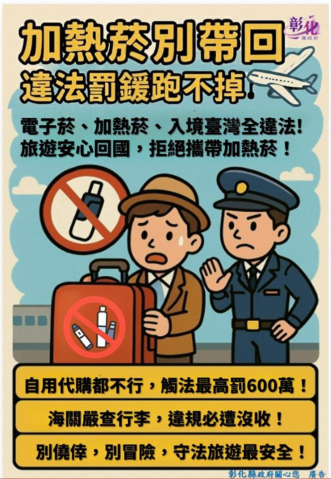 公告資訊 出國旅遊,請勿攜帶電子菸及加熱菸入境 發布日期 2026/01/13~2026/02/28 | 發佈單位: 財政處菸酒管理科 | 發佈日期: 分機7532817 | 更新日期 2026/01/13 | 瀏覽人數: 4人 春節連假將近,國人出國觀光人次增多,為民眾出國的高峰期,旅遊時購物也是重要的行程之一,出國購物切記加熱菸及類菸品(電子菸)不論數量多寡,都不可輸入或攜帶入境,彰化縣政府提醒民眾,無論送禮或自用或代購皆會受罰。 依菸害防制法及菸酒管理法相關規定,違者處新臺幣5萬元以上500萬元以下罰鍰或3萬元以上600萬元以下罰鍰。 民眾如有發現菸酒業者販賣未有中文標示或進口菸酒品未標示進口商之可疑菸酒品,可撥打檢舉專線0800-867890)提出檢舉。